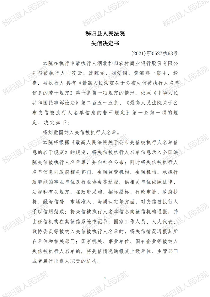秭归县人民法院 失信决定书